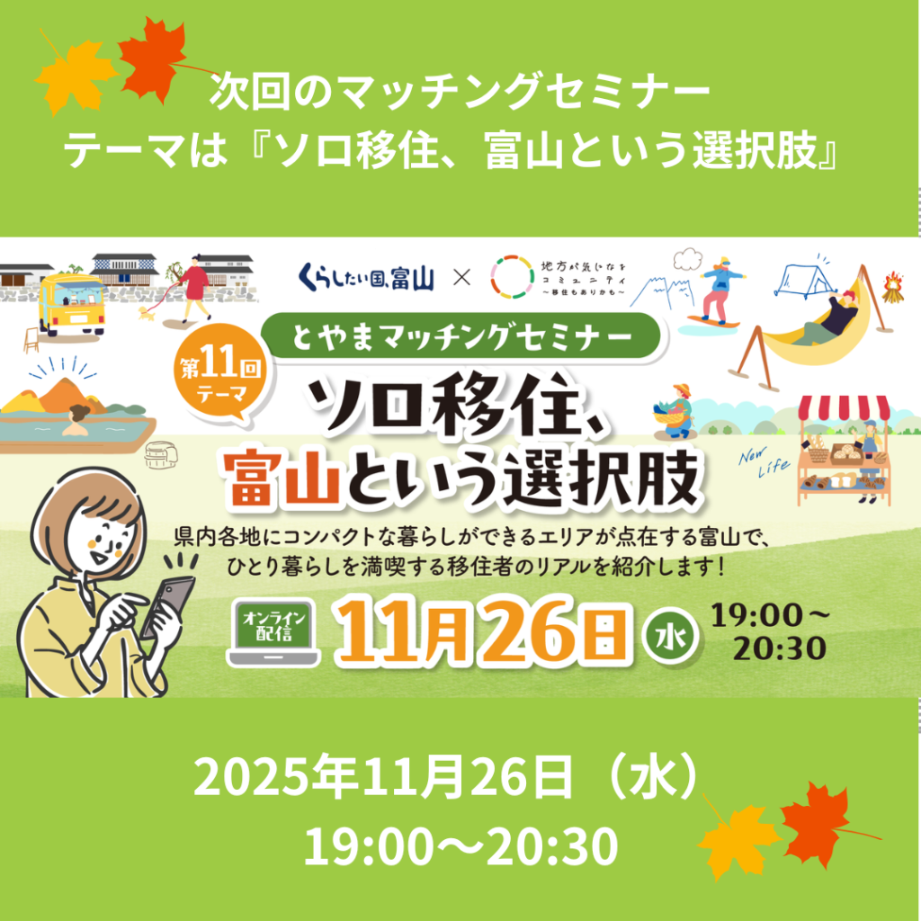 New!【視聴者の中から抽選で富山の特産品プレゼント♪参加者募集中!】とやまマッチングセミナー「ソロ移住、富山という選択肢」<開催日>2025年11月26日(水)19:00~20:30