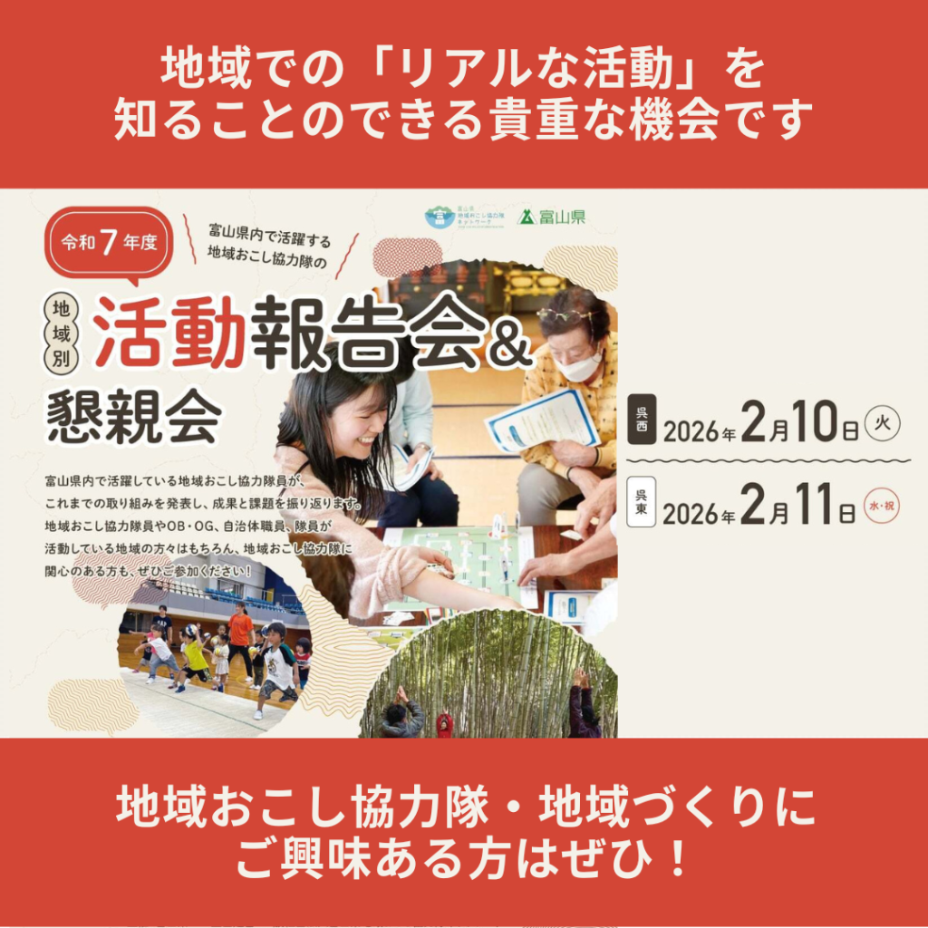 New!【2/10(火)・11(水・祝) 富山開催】地域おこし協力隊地域別活動報告会&懇親会を開催します!<開催日>2026年2月10日(火)13:30~17:00 ,2月11日(水・祝)13:30~17:00