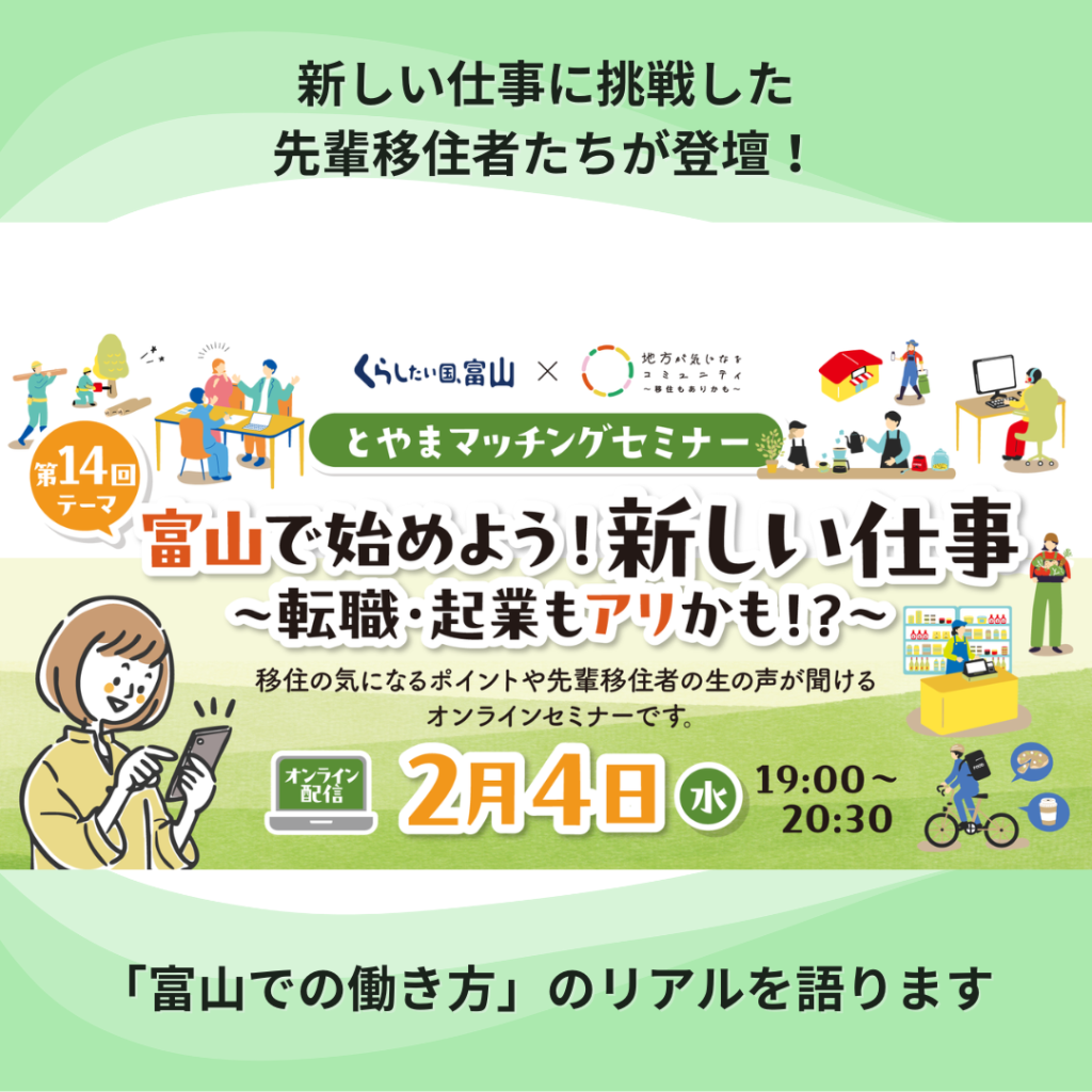 New!【視聴者の中から抽選で富山の特産品プレゼント♪参加者募集中!】とやまマッチングセミナー「富山で始めよう!新しい仕事 ~転職・起業もアリかも!?~」<開催日>2026年2月4日(水)19:00~20:30