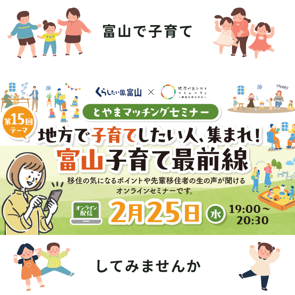 New!【視聴者の中から抽選で富山の特産品プレゼント♪参加者募集中!】とやまマッチングセミナー「地方で子育てしたい人、集まれ!富山子育て最前線」<開催日>2026年2月25日(水)19:00~20:30