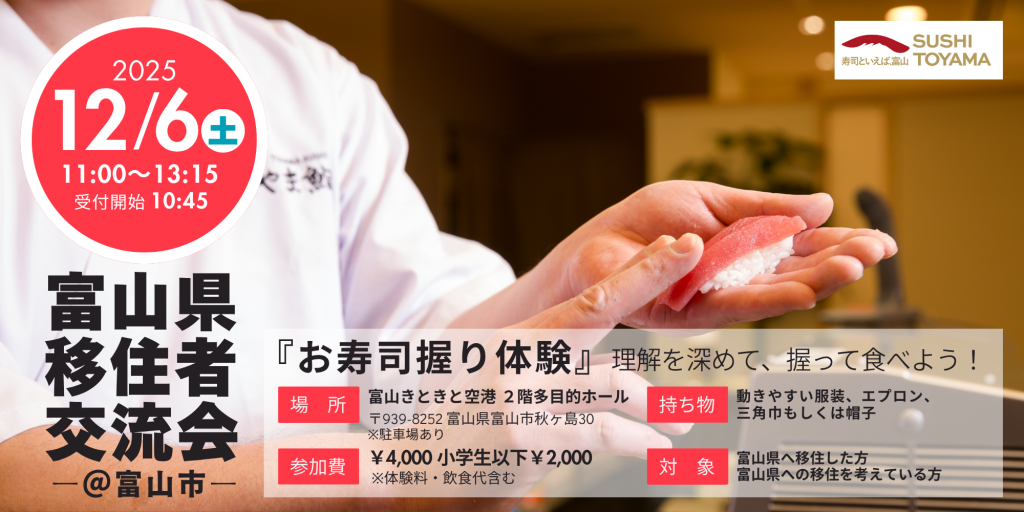今回の交流会では、富山県へ移住された寿司職人の方も交え、富山湾で獲れるお魚について学び、本物の寿司職人さながらに美味しいお寿司を握ってみる体験をします!