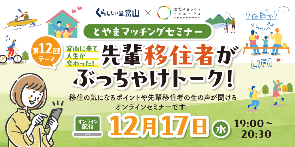 【視聴者の中から抽選で富山の特産品プレゼント♪参加者募集中!】とやまマッチングセミナー「富山に来て人生が変わった!先輩移住者がぶっちゃけトーク!」