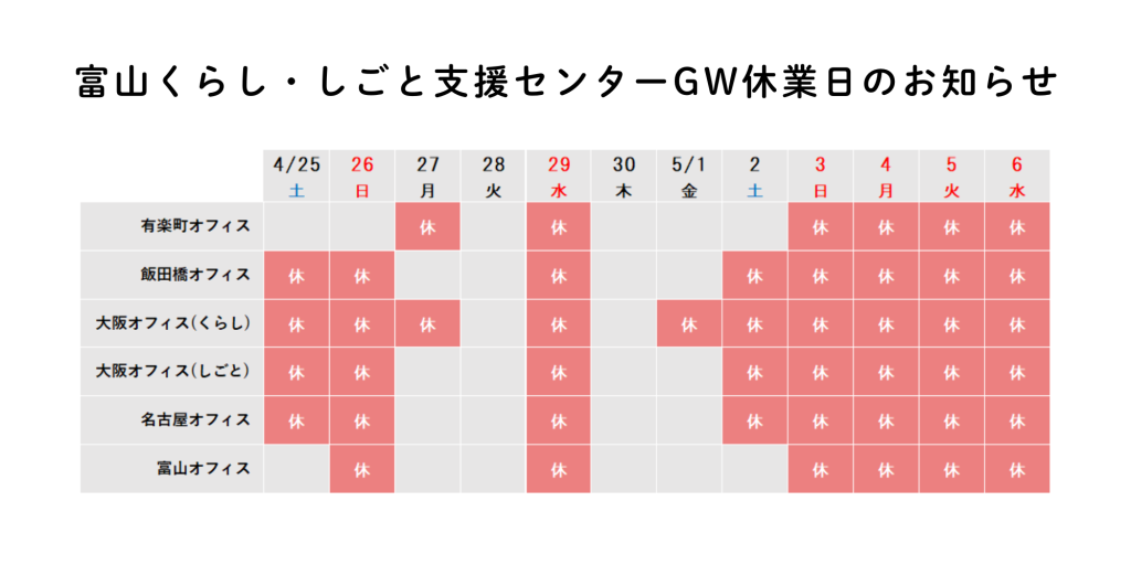 富山くらし・しごと支援センターは、GW期間中下記日程で休業いたします。